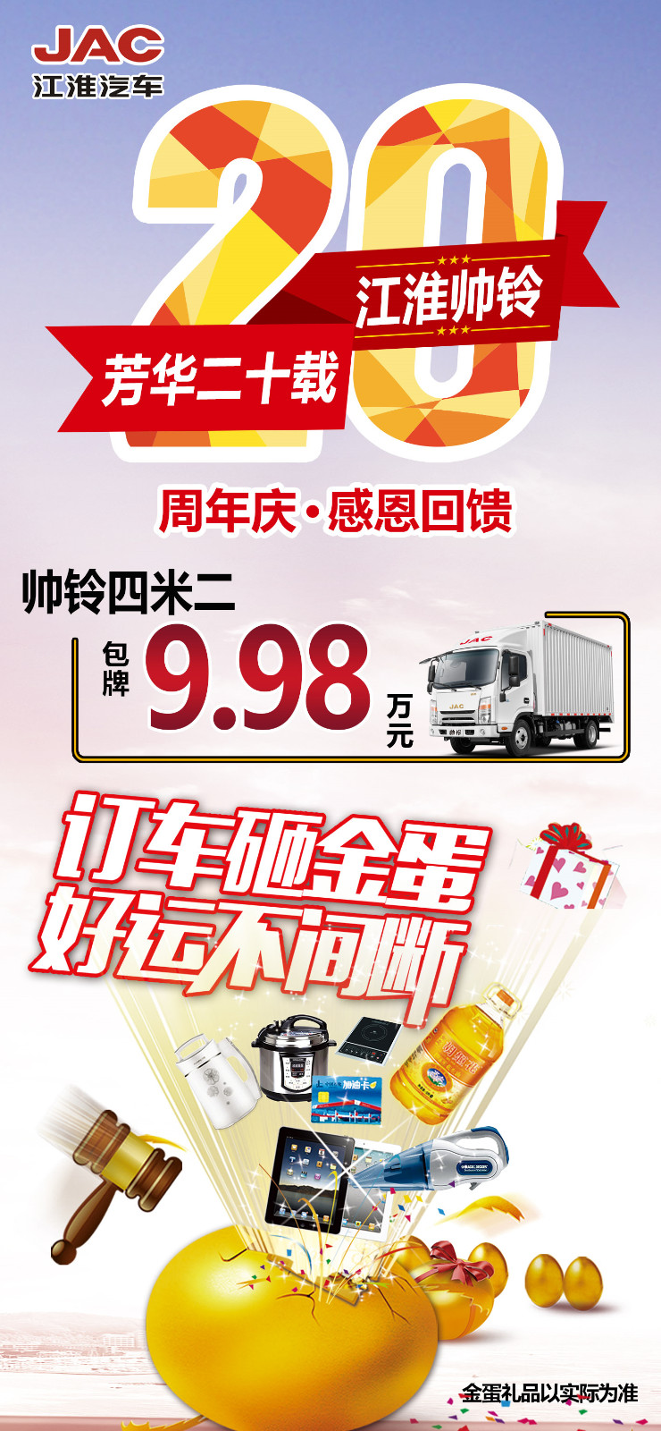 帅铃周年庆价格提前享4米2包牌仅需9.98万订车砸金蛋抽取家电0首付0利息厂家直销价电话:15112721325